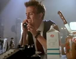 He desperately grabs the milk container, but nothing more than a few drops come out.