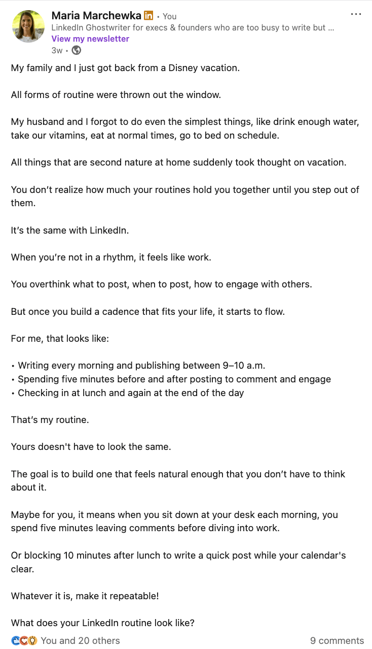 Even I skim or skip posts when they’re dense or directionless…but if a post hooks me with a story or a moment that grabs me, I’m in. I’ll read every line.