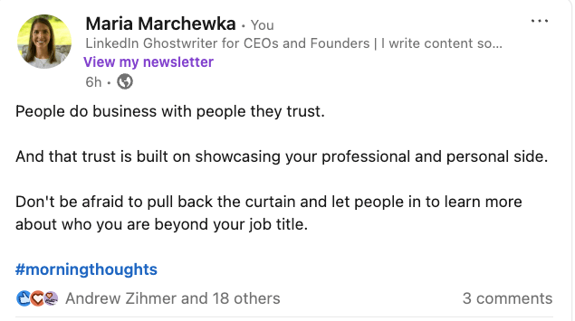 While I agree to an extent (messy drama like broken friendships and neighbor spats aren’t meant for LinkedIn), there are ways to pull your personal life into your posts.