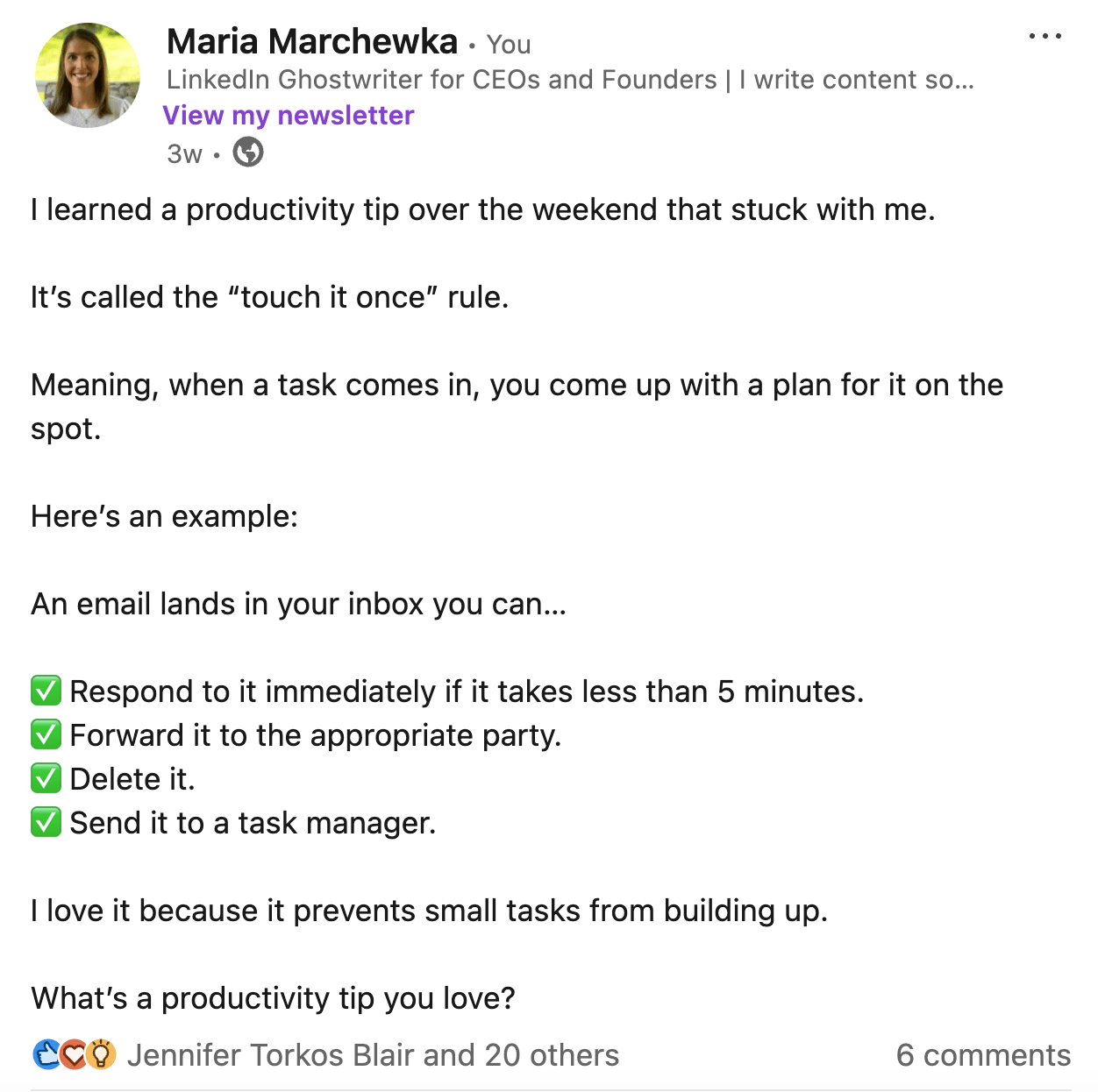 Sharing productivity tips is a great way to encourage engagement and spark conversations in the comments.