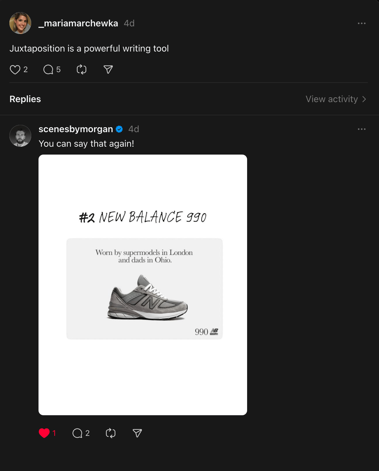 Morgan Parry (Check out his newsletter: Creator Coffee Break) reminded me of this New Balance ad in our Threads exchange, and now it’s my I Wish I Thought of That Thursday feature.