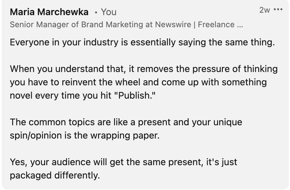 Really, the goal of this email is to show you that you don’t have to come up with some novel concept every time you post.